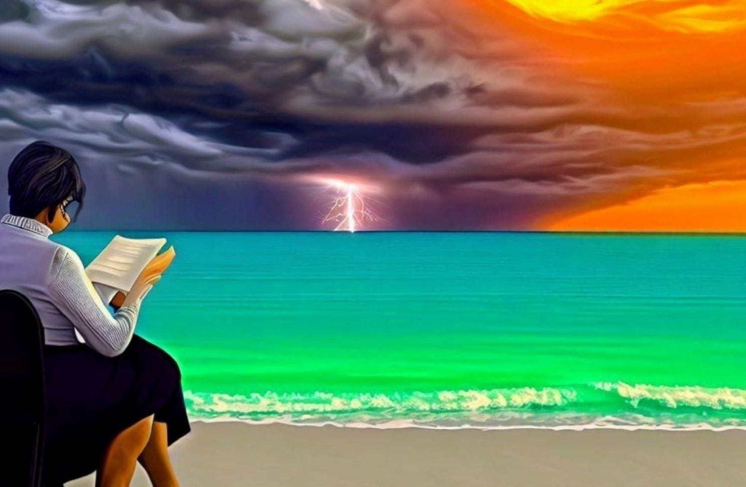 The image below was for my very first article about developments over the summer. I used DALL-E 2 and hit the mark on the first try in terms of tone, color, and image. However, it also gave the professor a weird, dog-like face. Again, dozens of attempts later, I gave up and went with the dog-faced figure hoping the storm and sunrise were eye-catching enough to pull the viewer to the horizon and its vibe of dangerous possibility.