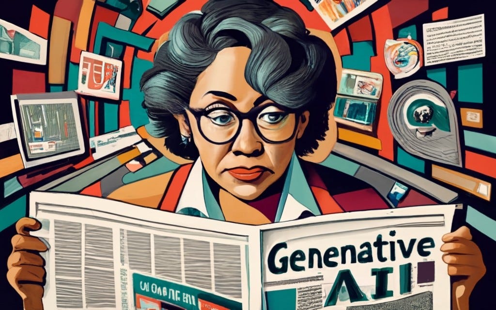 My first attempt to use words in an image was the one below, the header for an article about generative AI as the new buzzword in higher education, an exploration of the ways bias and discrimination are embedded in the output from these tools, and questions about who makes up the user community for generative AI. I was pleased with the output, which was created in response to my first prompt, but it left out the “r” in “Generative.” After dozens of attempts, most of which included robots and all of which misspelled “generative,” I gave up and hoped readers would miss or forgive the misspelling.