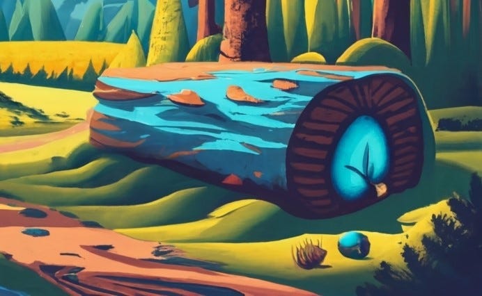 My first try didn’t work when it came to the image below, the first logo for my newsletter. I went through several attempts using prompts with “electric blue log” or “log with blue electricity flowing through it.” I finally got something reasonably good by abandoning my original prompt and asking for a log with a blue non-robot figure on it. The humans all looked too weird, but I finally hit with a prompt asking for an electric blue bug on a log. It left out the bug but somehow produced an image I thought worked okay as an 𝑨𝑰 𝑳𝒐𝒈.
