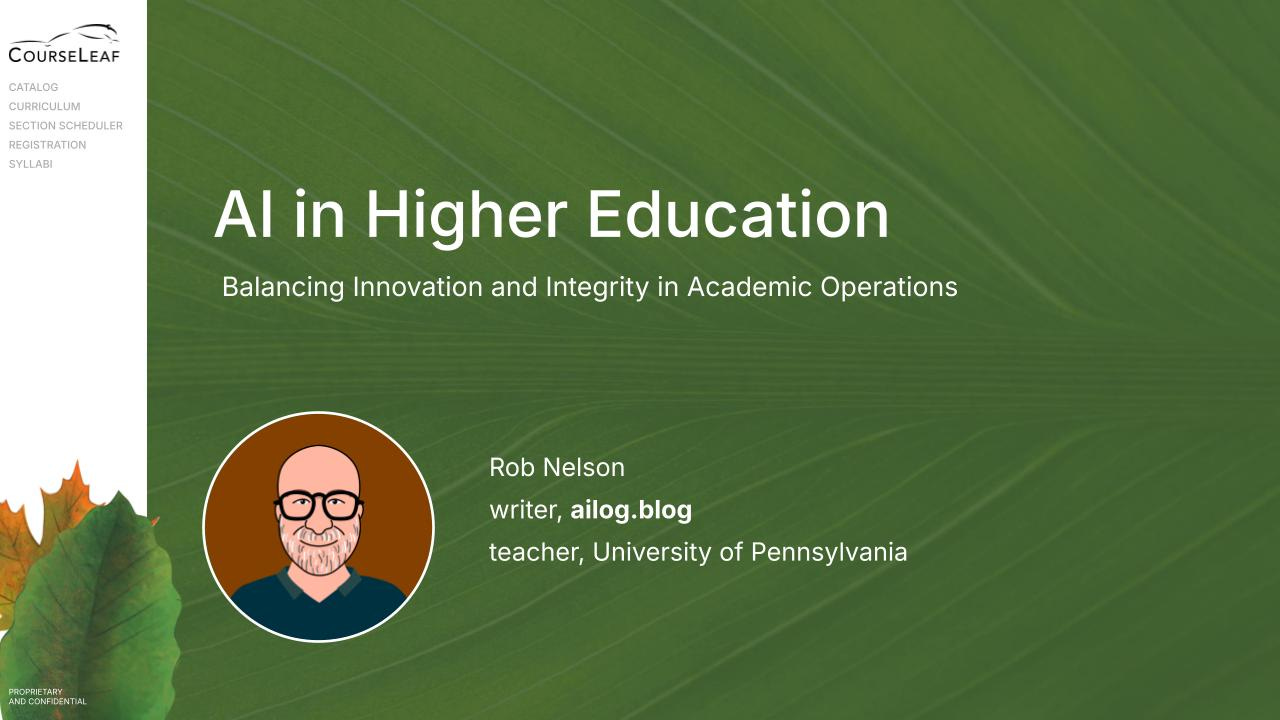 Hi, Iโm Rob Nelson. I was an academic administrator in the Provostโs Office and a part-time teacher at Penn for many years. Last October, I left my job as a bureaucrat to write and speak about AI full-time while continuing to teach. Earlier this year, I started working with Leepfrog on their AI strategy. Todayโs webinar reflects some of that work.