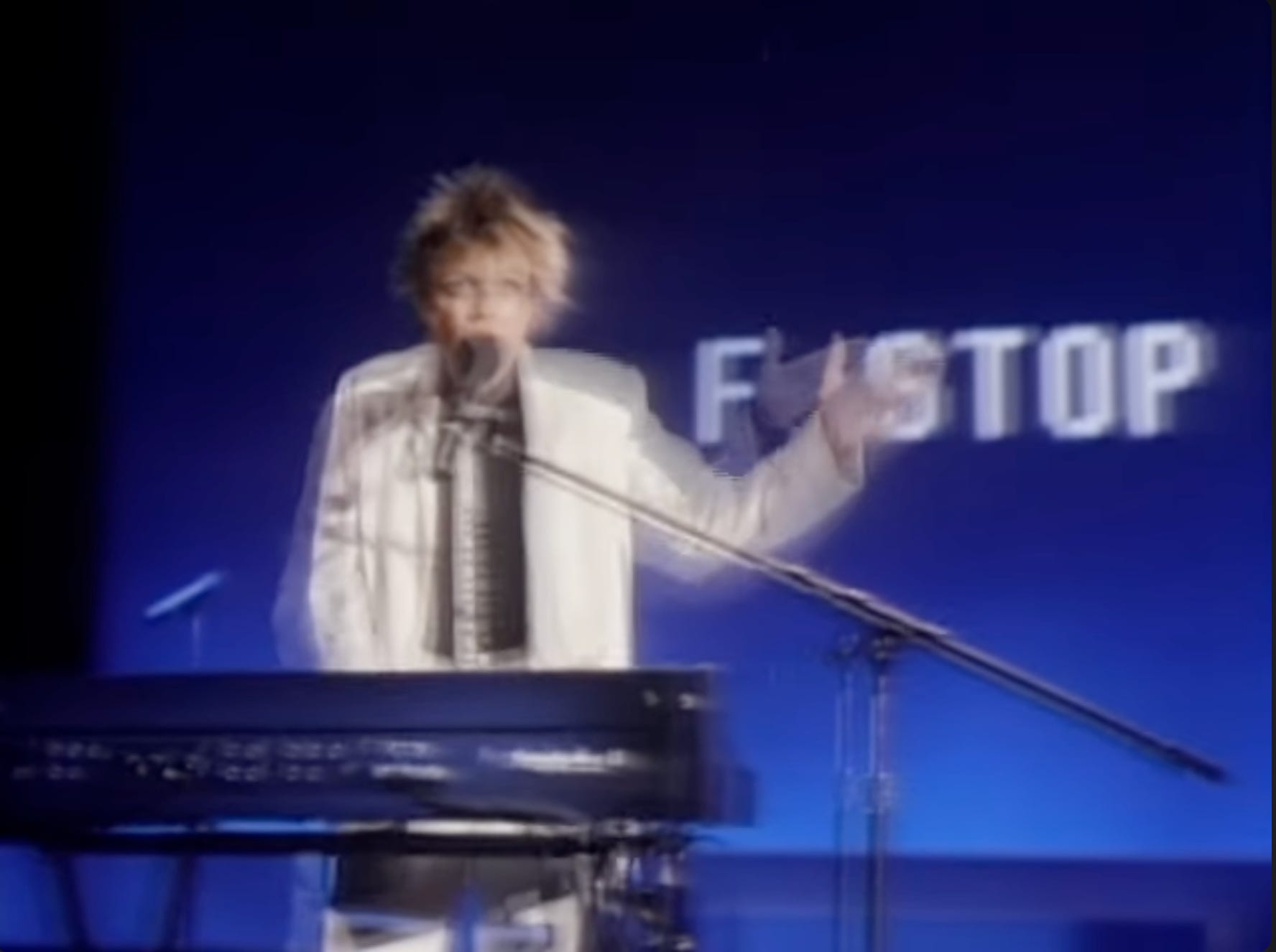 One last analogy, this one returns to the blurry image of Laurie Anderson’s performance of Language is a virus that I placed at the beginning of this essay. In it, Anderson uses her left hand to intrude upon the words on the screen, moving it in front of the screen between the letter F and the word STOP, gesturing so that the sign briefly becomes F-STOP.